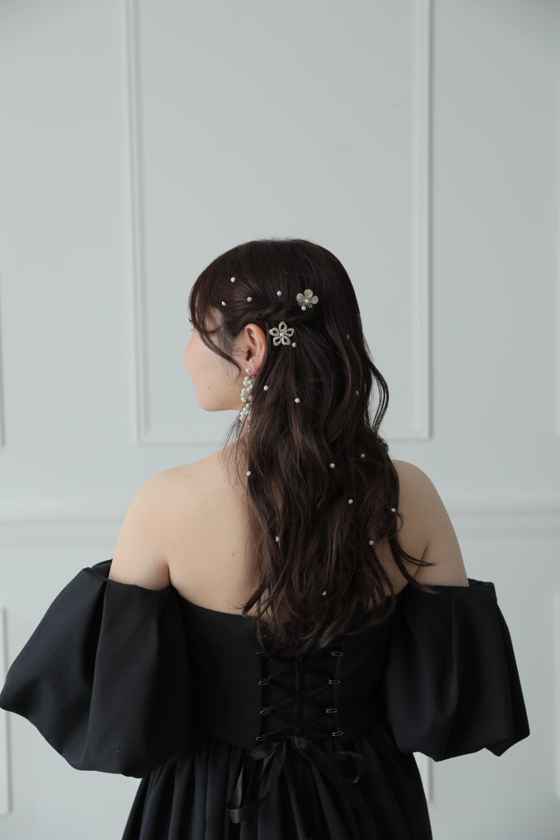 ゆるふわ巻きにパールを散りばめたダウンスタイルです ネイビーのカラードレスにパールの組み合わせがとても可愛いですよね! 遠目から撮ってもパールがしっかり写ってきます♡
