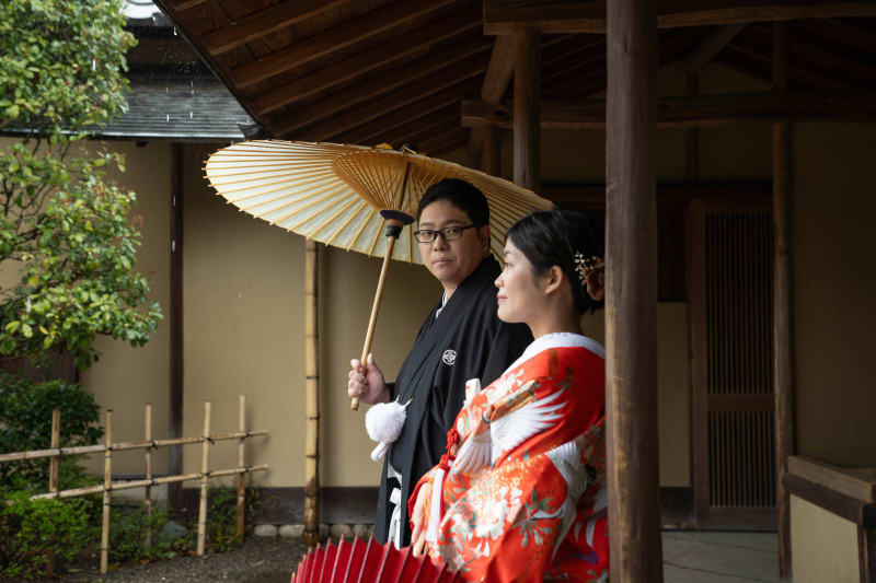 屋根を弾く雨粒や、新郎様の穏やかな表情が素敵な一枚です。