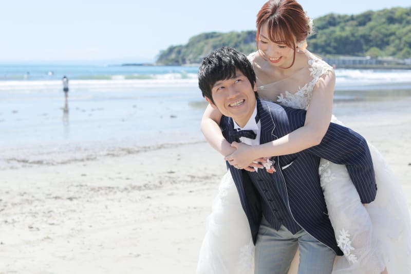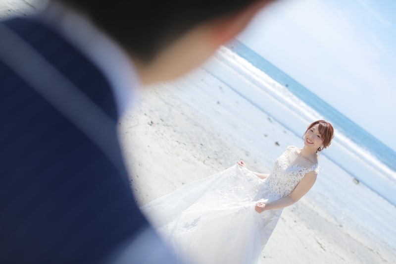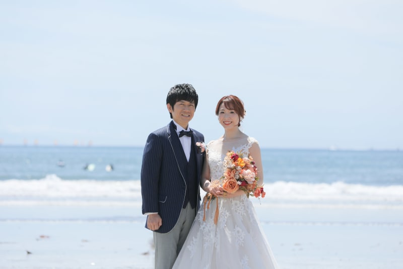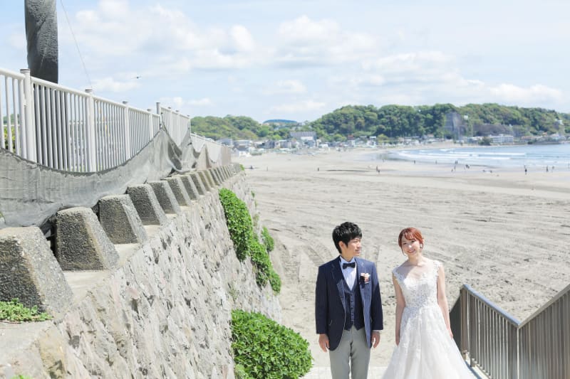 本日は、由比ヶ浜で撮影したお客様をご紹介します^^ 撮影日はとっても天気が良く、ウェディングドレスがキラキラと輝いていました☆ 心地よい風が吹いていて、少し靡く新郎さんのタキシードと新婦さんの髪が印象的でした。