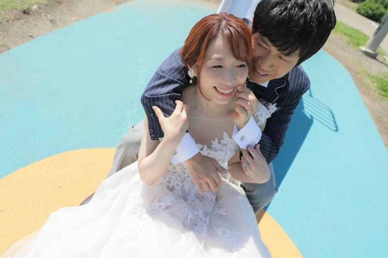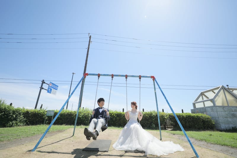 湘南プランの良いところは、近くにある公園でも撮影できるところです! 青空一面の背景でブランコを漕いでみたり、滑り台を滑るところを撮影してみたり・・・。 夢が広がりますね!