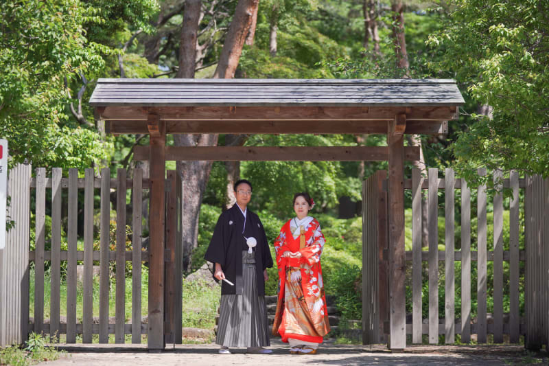 まずは大宮公園の中にある、日本庭園の門の前にてかっちりとしたポージングでの撮影。