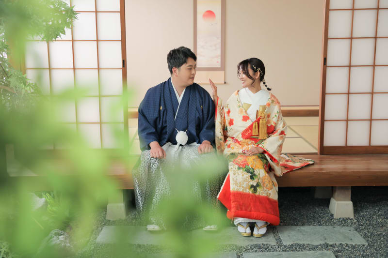 縁側に座って おふたりの笑顔がとっても可愛らしくていい感じです。