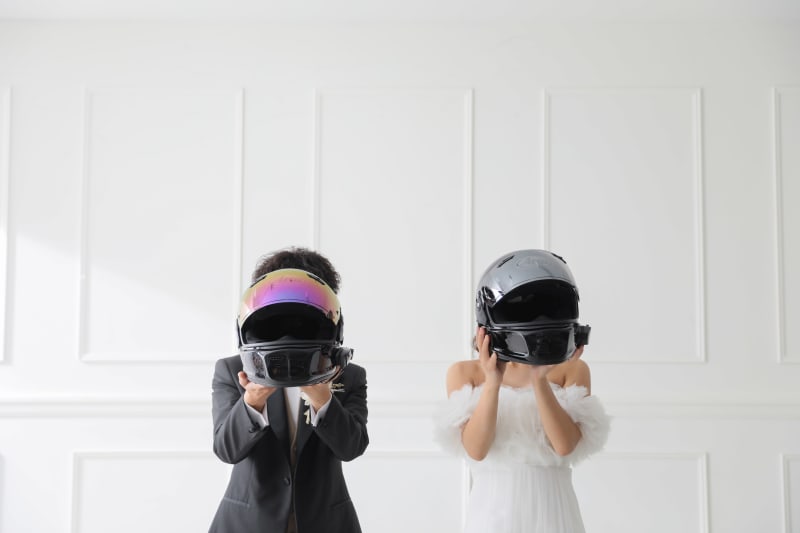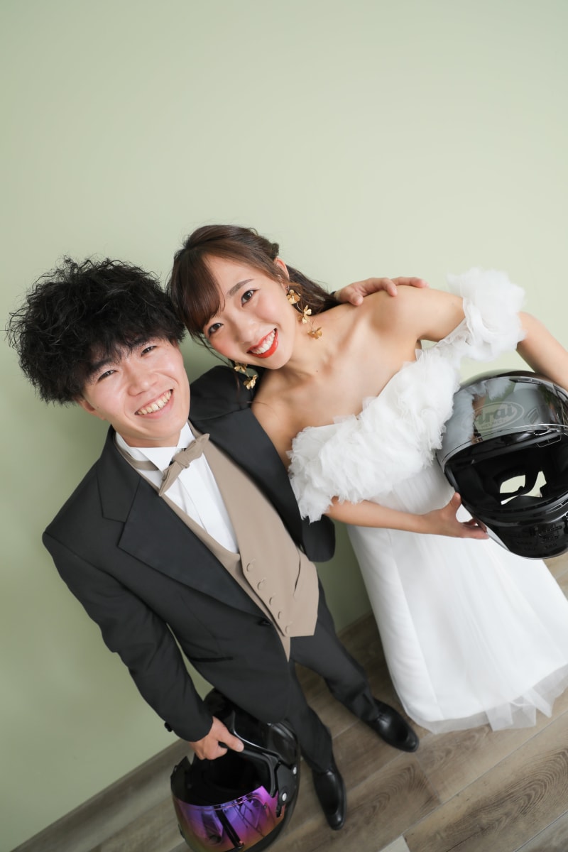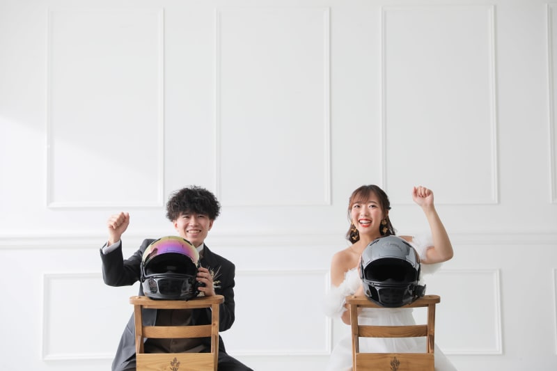 ヘルメットをお持ちいただいたので白の背景でお二人を目立たせるようにお撮りしてみました!