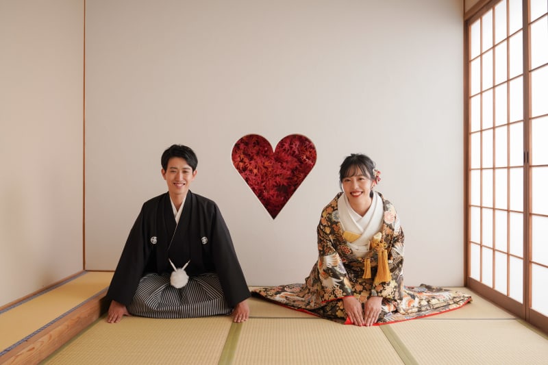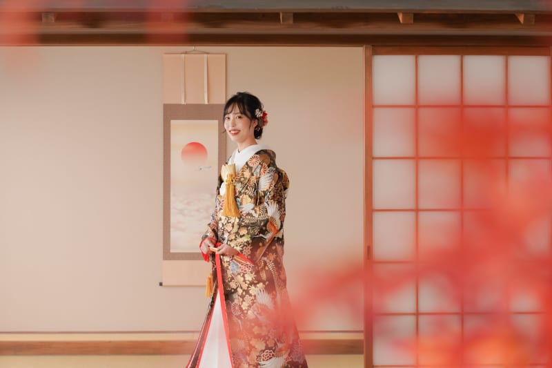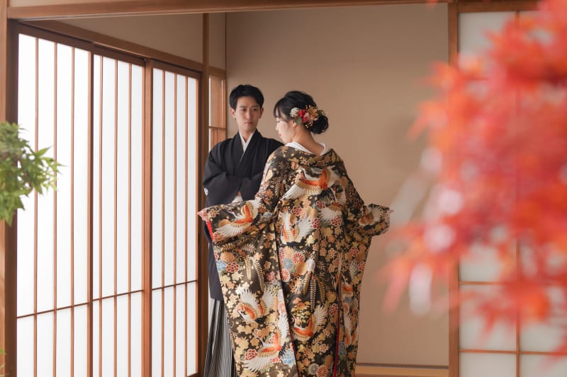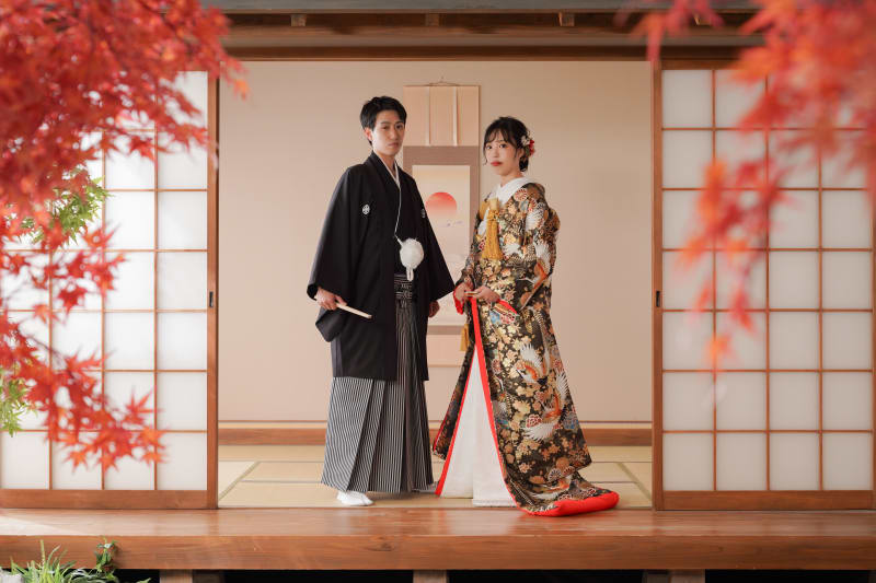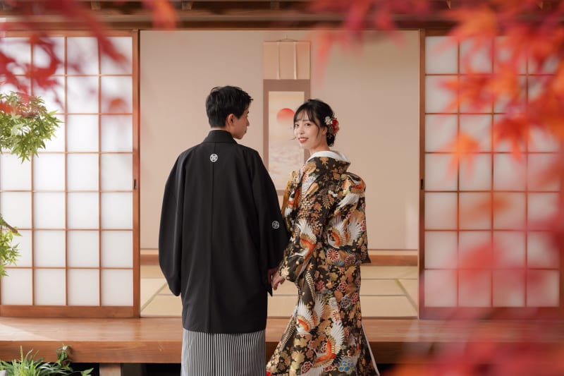 紅葉をいれて撮影いたしました。スタジオ撮影では写真のように季節に関係なく、紅葉や桜をいれた撮影が可能です!