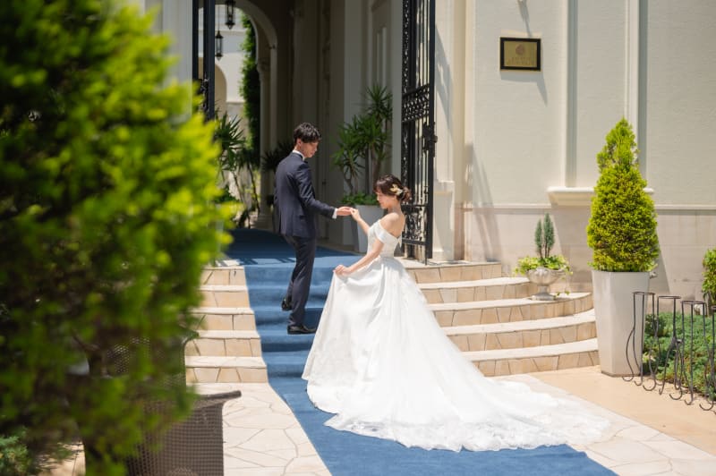 まずは階段での撮影からスタート!!新婦様がこだわって選んだ衣装も、後ろ姿までしっかりお写真を残していきます^^