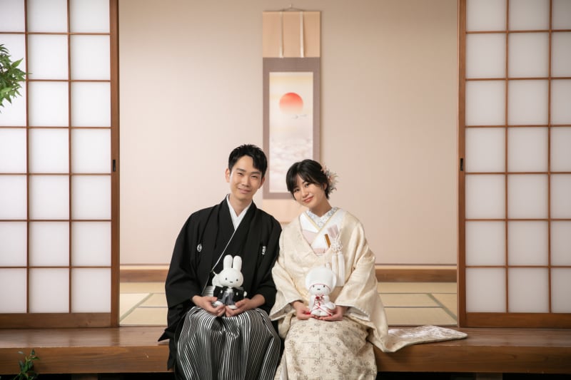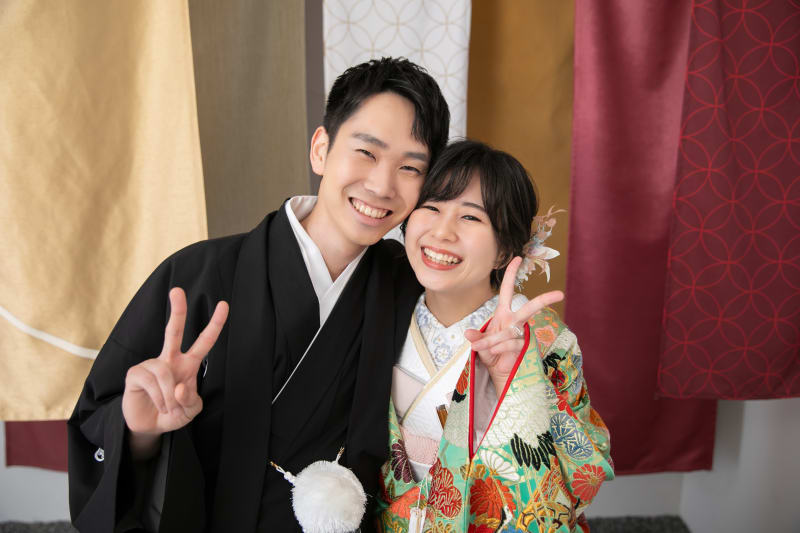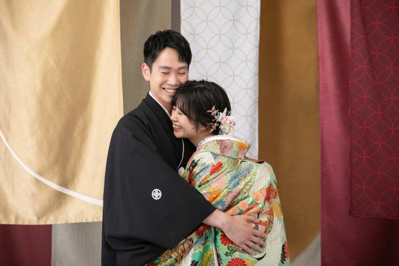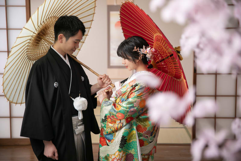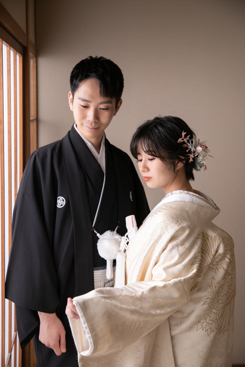 新郎様が着用されている黒紋服にシルバーグラデーションの袴合わせは明るい印象になるので