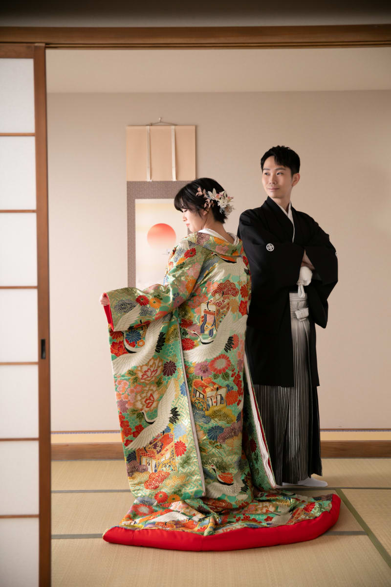 新婦様の着物をグリーンの色打掛から白無垢へチェンジ!!