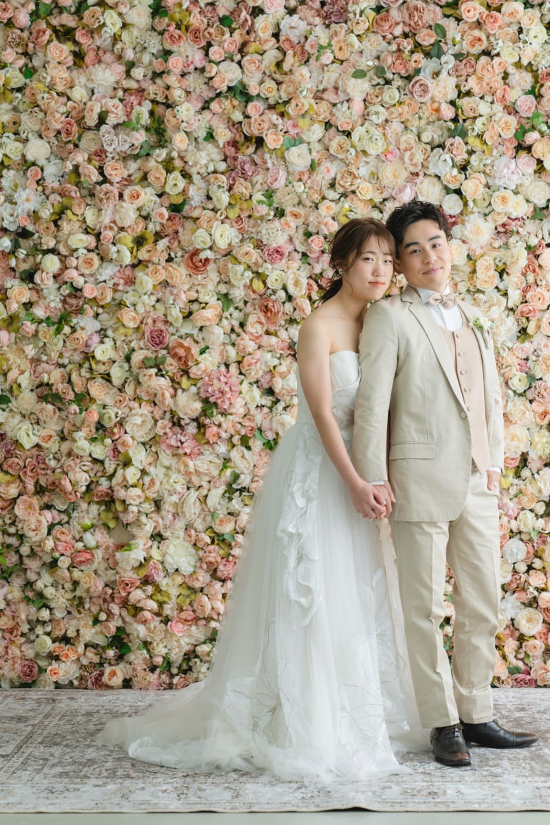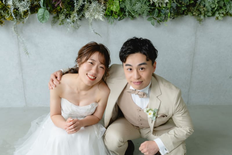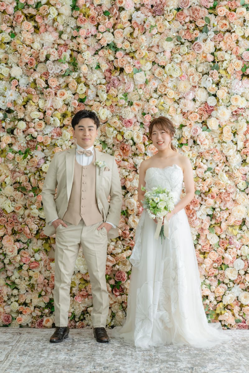 白のドレスとベージュのタキシードの組み合わせがぴったりですね♡