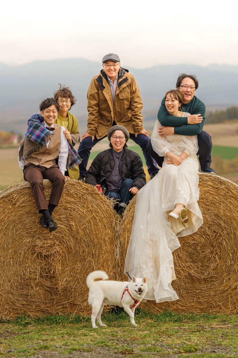 「全員で1つの家族ということを表現したく、あえて並びを両家で分けることはしませんでした。愛犬も含めていい表情になるまでシャッターを切り続け、全員笑顔の瞬間を収められました。」
