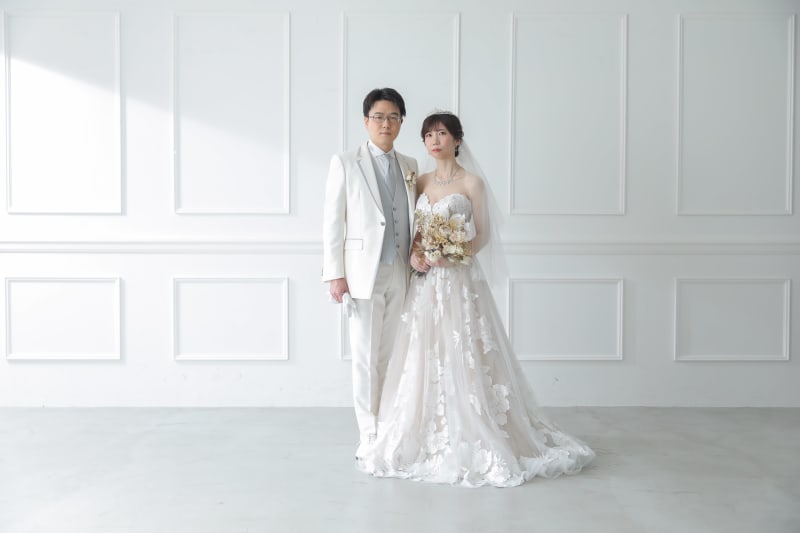 お次は、洋装のご紹介です。 お二人のフォーマルな立ち姿もお撮りします。背景がシンプルだからこそ、衣装が映えますね。