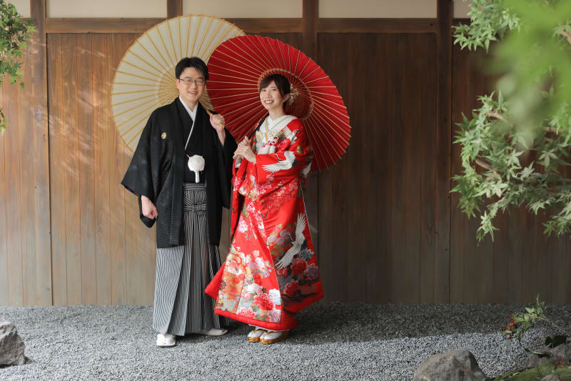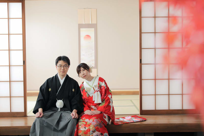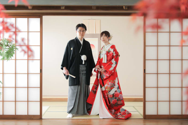 手前に置いてある紅葉の木を新緑、桜、紅葉の三つ中からお選びいただくことも可能です。 お二人のお好きな季節に合わせてお写真残しましょう。