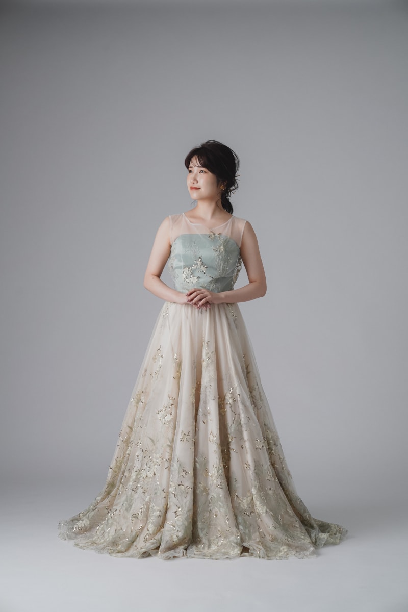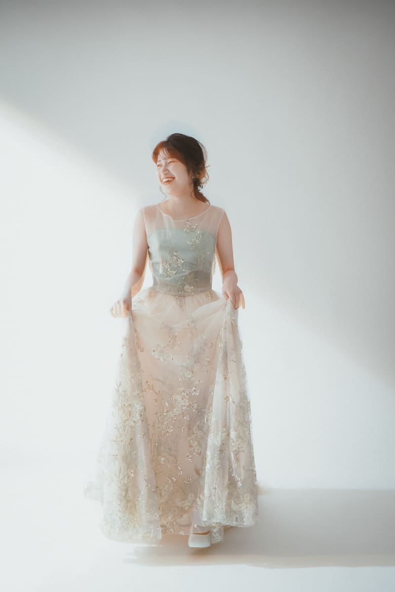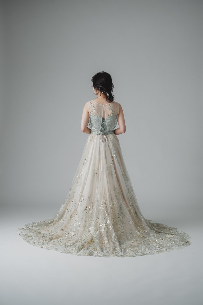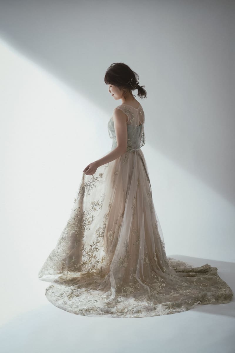 こちらのドレスはくすみのグリーンに華やかな刺繍がポイントになっています♡
