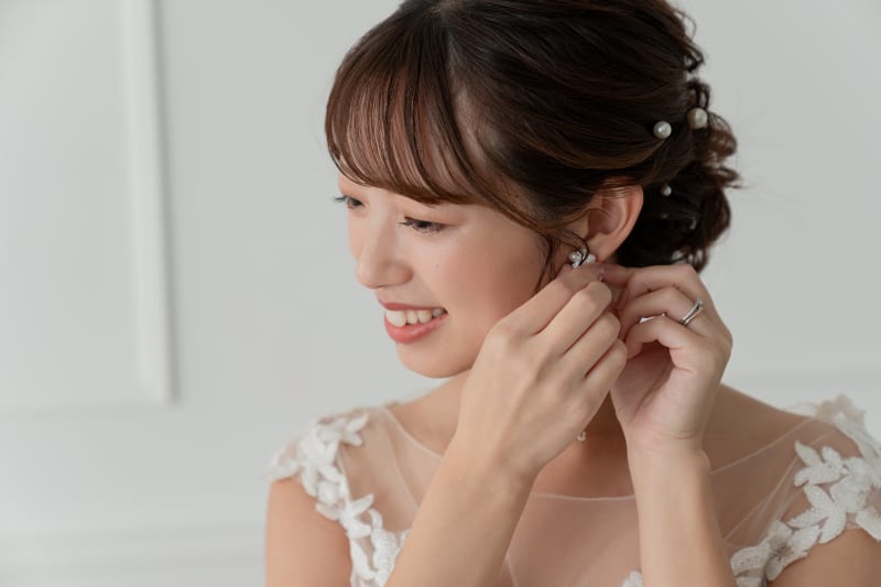 ご新婦様がイヤリングをつける様子。
