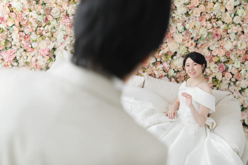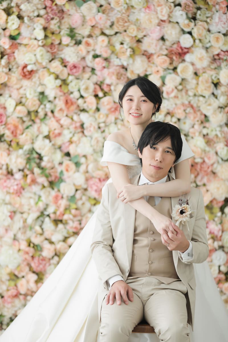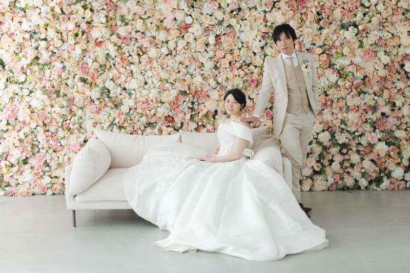 一面がお花で敷き詰められたフラワーウォールでの撮影も可能です! お二人の好きな背景を選んでお写真を残しましょう!