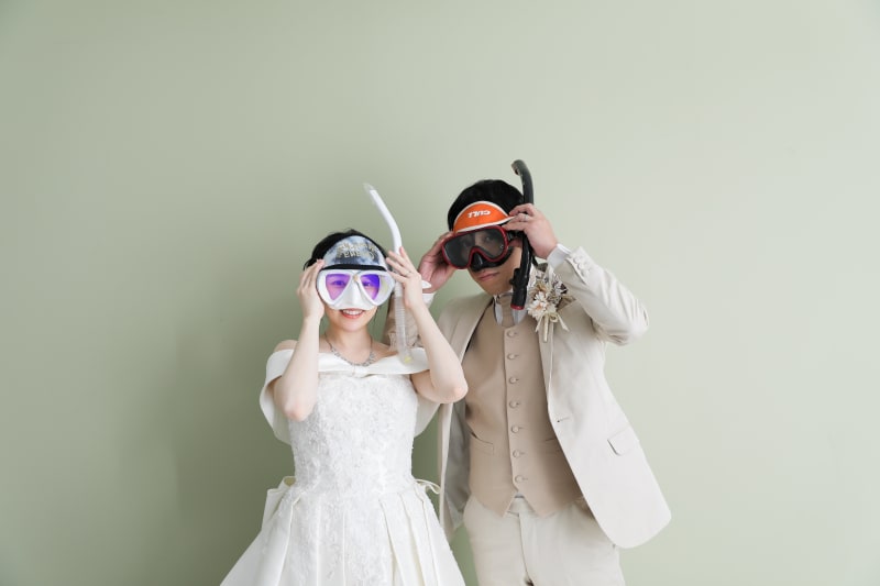 お持ち込みいただいた小物と撮影。 小物を使った撮影も可能です!お二人のお気に入りの小物と一緒に撮影しましょう。