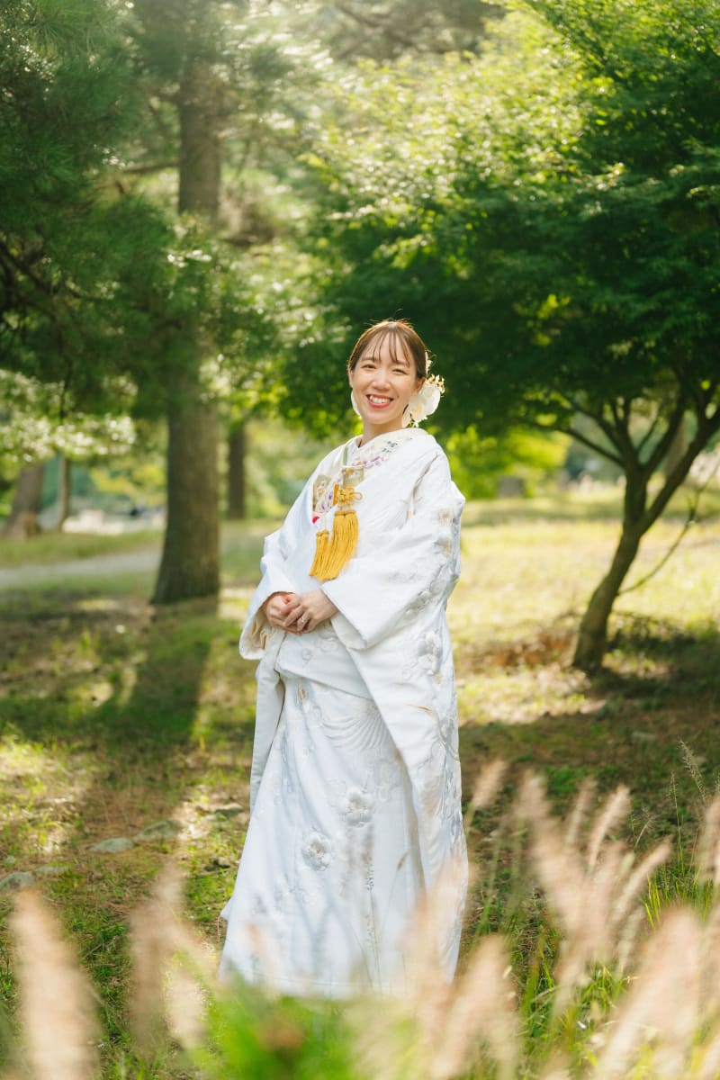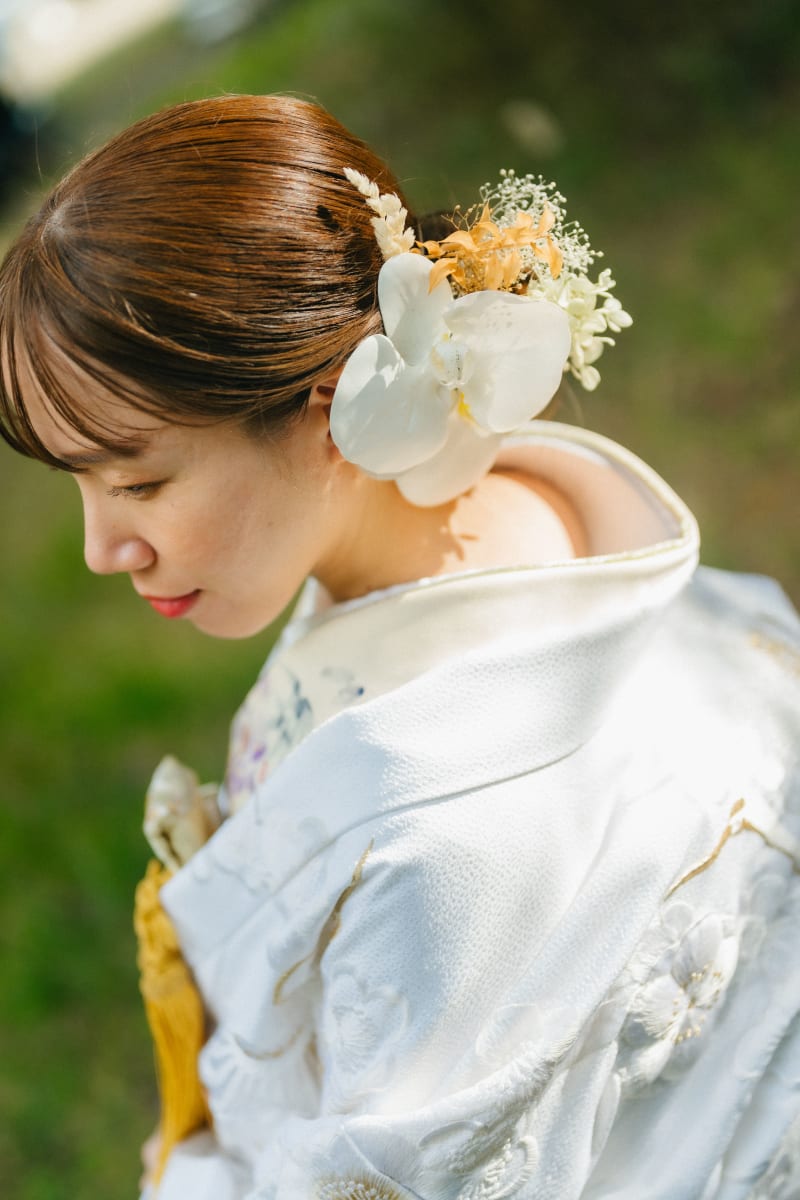 新婦様のソロカット!柔らかい光の演出で温かい雰囲気に! 笑顔が可愛すぎてたくさん撮ってしましました!新婦様の髪飾りも和装の衣装とマッチしていてとてもお似合いです。