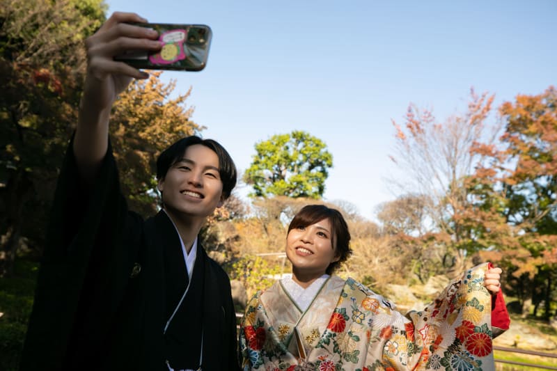 紅葉シーズンを迎えた花田苑で笑顔の撮影