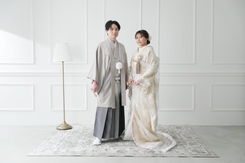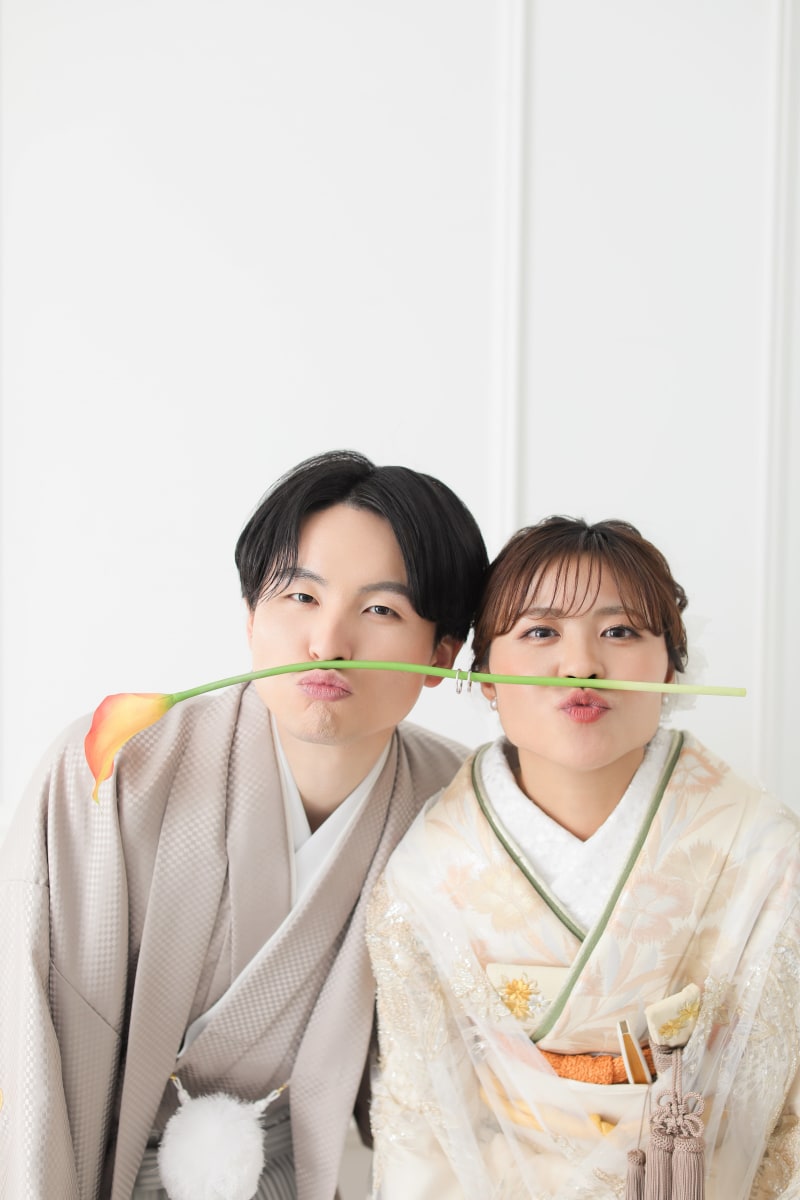 お次は、店舗に戻ってスタジオで撮影!!衣装を変えて。背景がシンプルだからこそお二人の衣装が映えますね。
