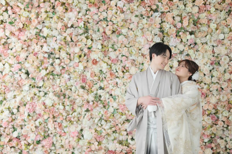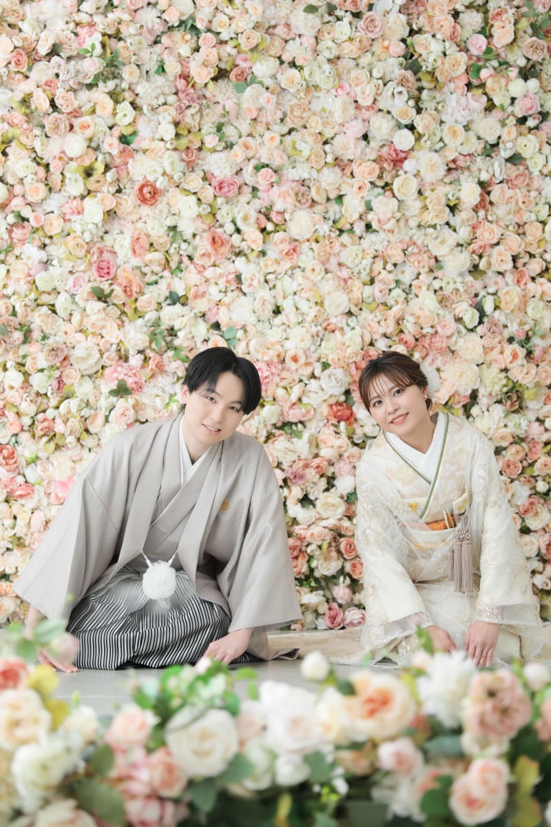 一面がお花で敷き詰められたフラワーウォールでの撮影も可能です! お二人の好きな背景を選んでお写真を残しましょう!