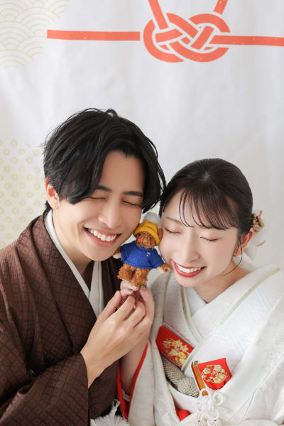 和装らしく和傘を持ったショットや、お二人がお持ち込みしてくださったくまちゃんと撮影をさせていただきました。