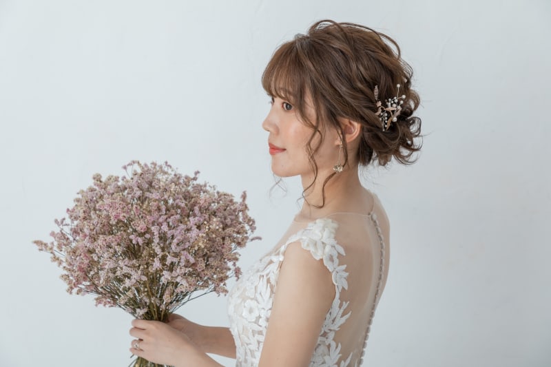 髪飾りをドライフラワーにすることで、かっちりし過ぎないようにしてます♪