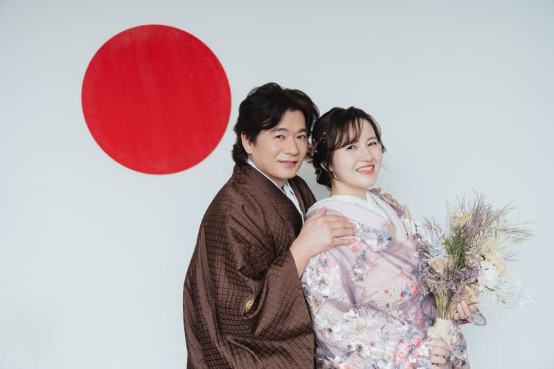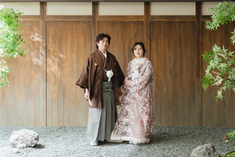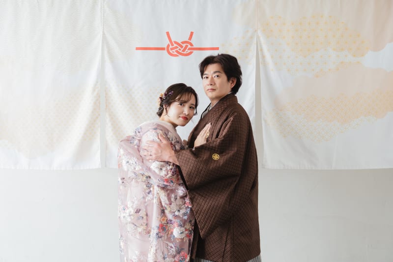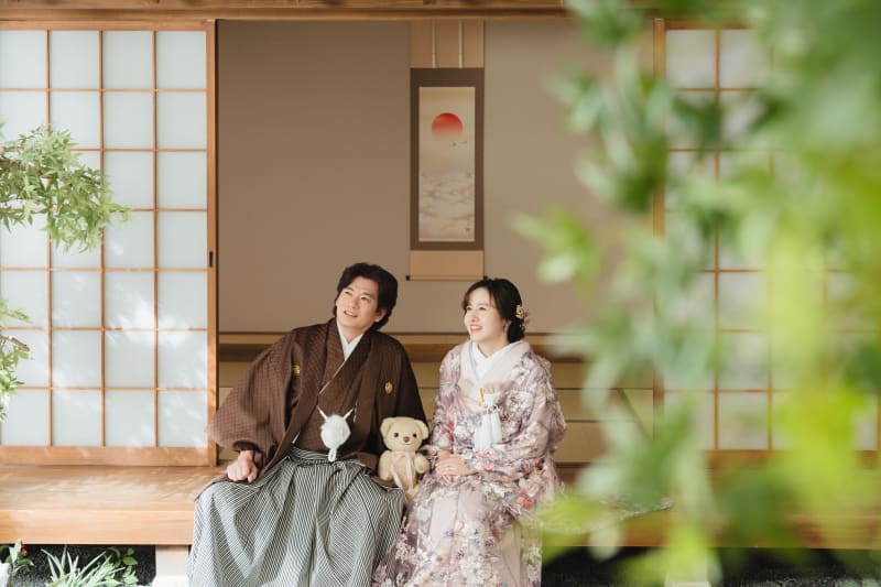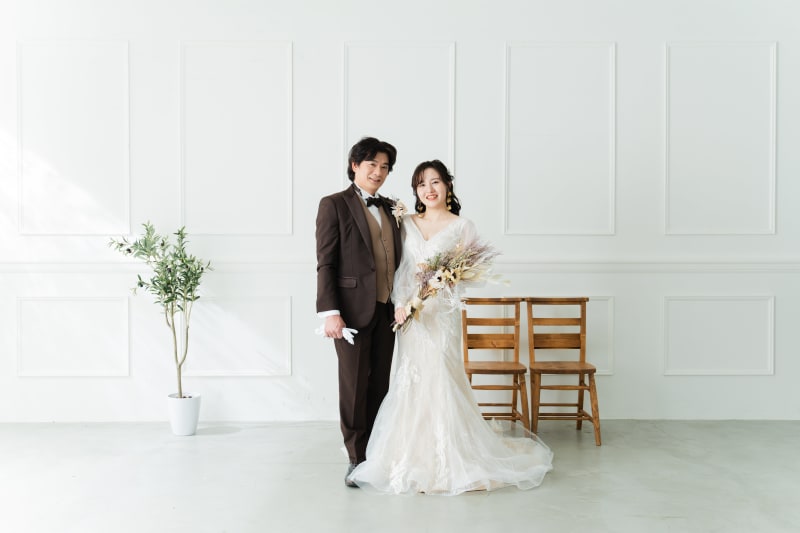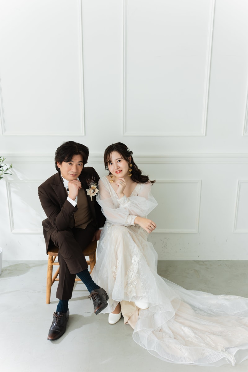 お次は衣装を変えて! 洋装の撮影です。背景がシンプルだからこそお二人の衣装が映えますね。