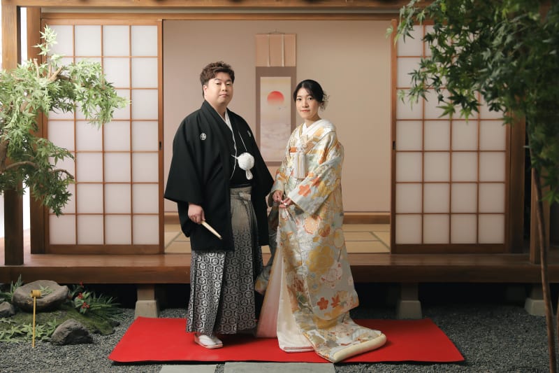 和装の伝統的な立ち姿!こちらのカットは台紙にも入るもっともフォーマルな一枚です。お二人の記念に是非残しましょう。