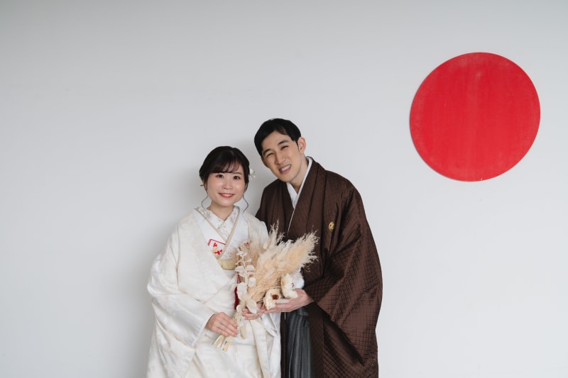 日の丸背景で、ブーケを持ってふたりで。寄り添っている感じが可愛いです。