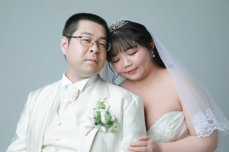 ちょこんと座る新郎さんに寄り添う新婦さん。