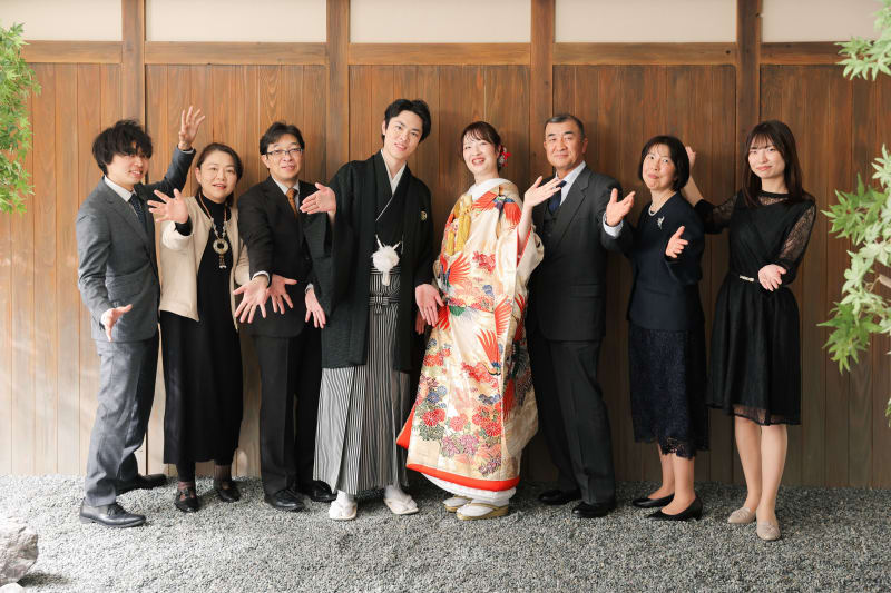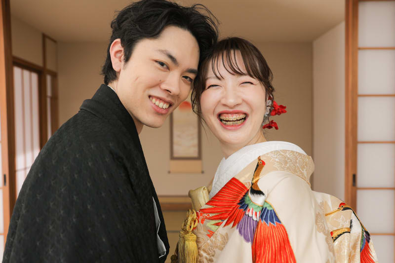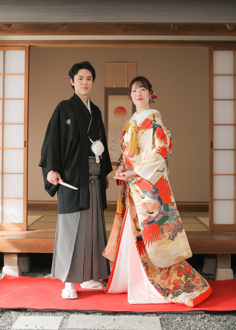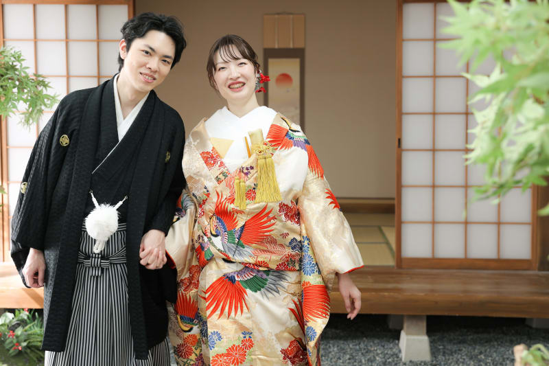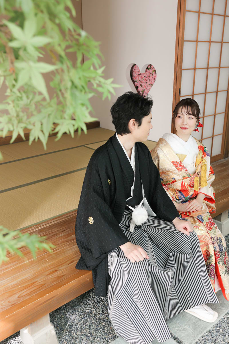 茶室の前や縁側での撮影はまた違った雰囲気になります。ハートの猪目窓が中央にあっても、背景にあってもワンポイントとしてキュートさをプラスしてくれます。