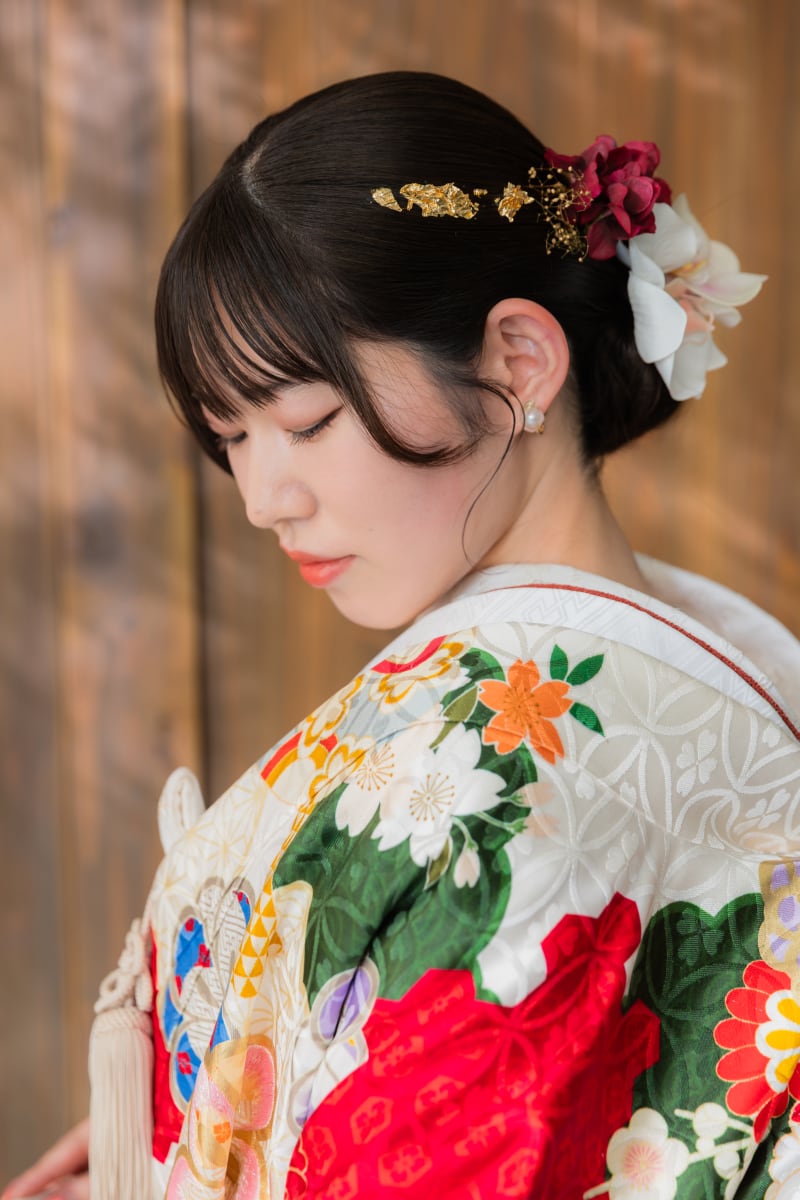 後ろ姿のお写真は、お着物の鮮やかな柄がよく映える一枚になっています!