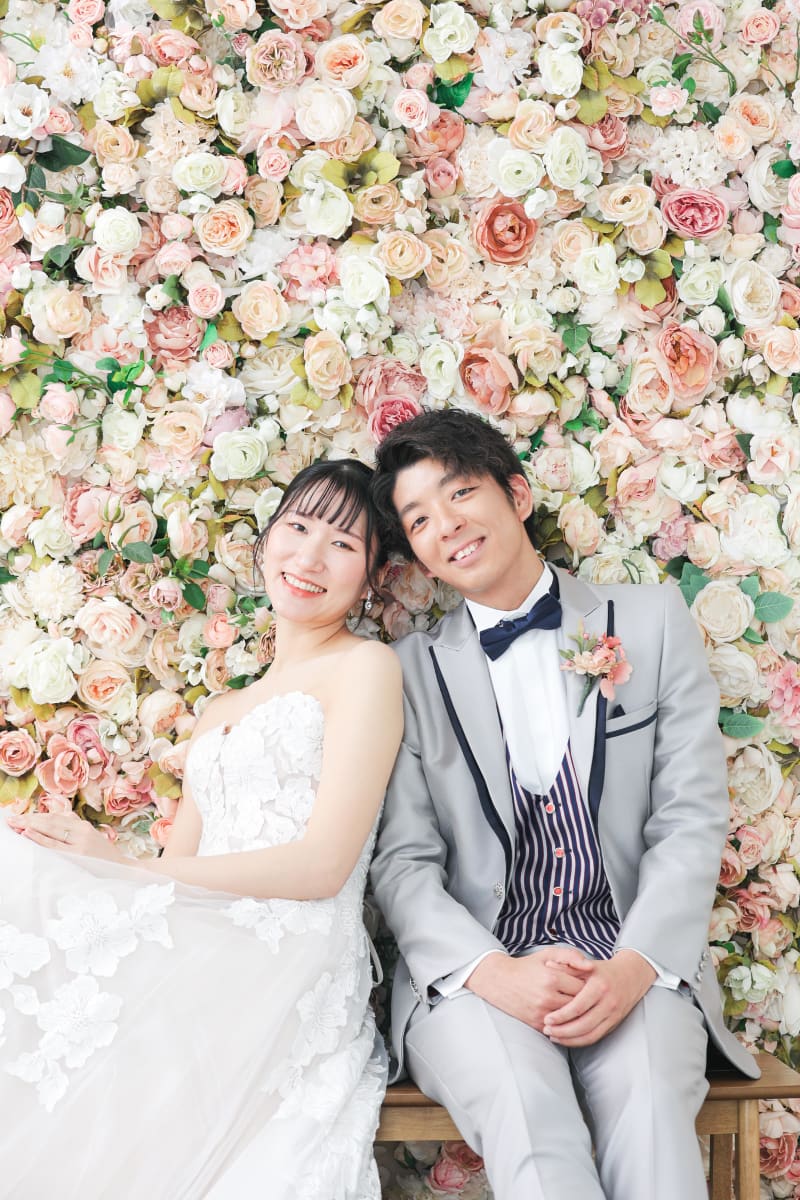 フラワーウォールの背景では可愛いドレスが更に引き立ちます!