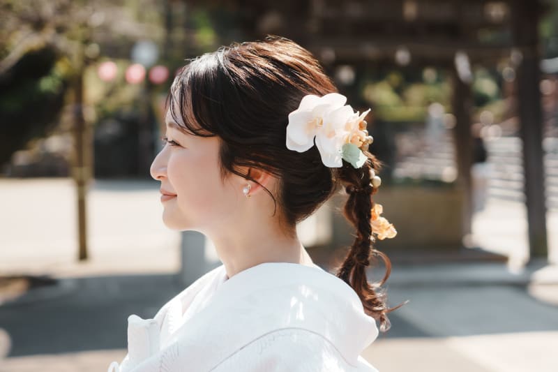 白無垢に合わせた胡蝶蘭と差し色のオレンジの髪飾りが素敵ですね!