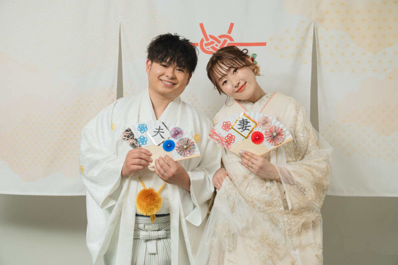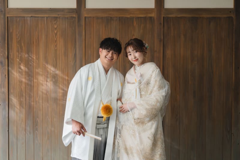 ご新郎様のホワイトのお着物とも相性ピッタリで、並んだ姿も素敵ですね◎