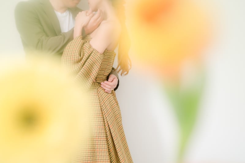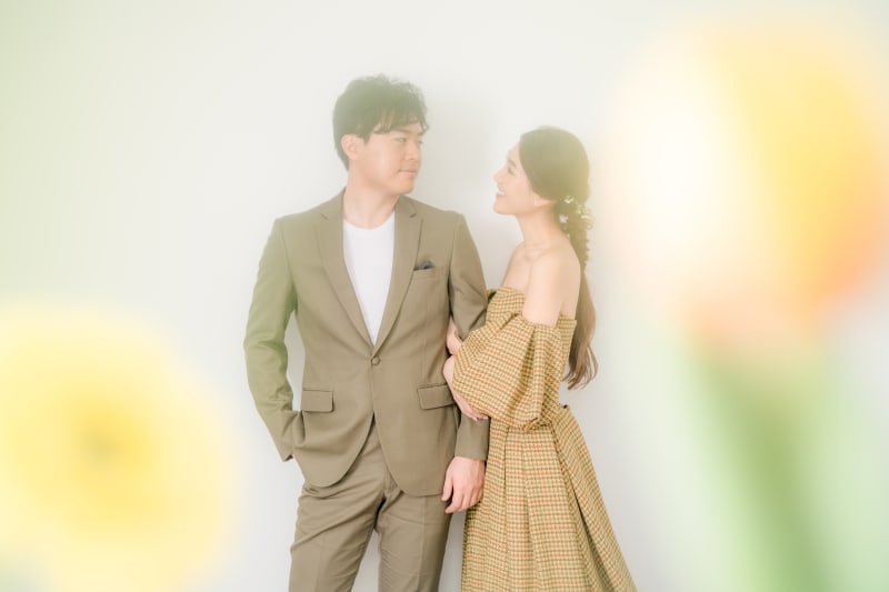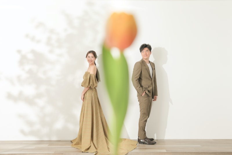 お花のかげや、本物のチューリップを使ってスタジオ撮影の中に春を取り入れ、 お洒落な一枚を作り出します^^