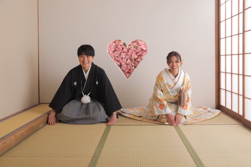 正ポーズ!!京都の宮大工さん監修で作り上げたお茶室の前で、お二人に並んでいただきました。ハートの猪目窓の前で和装ならではの正座ポーズ!