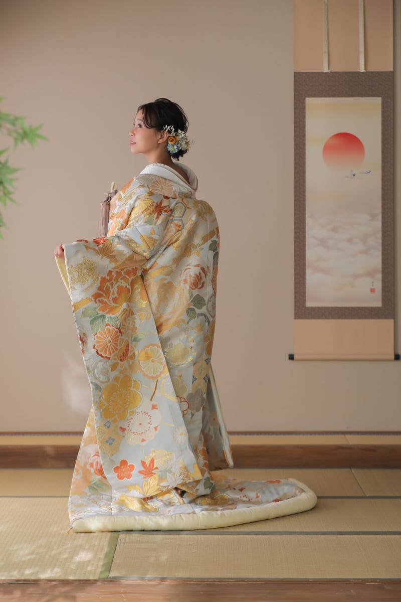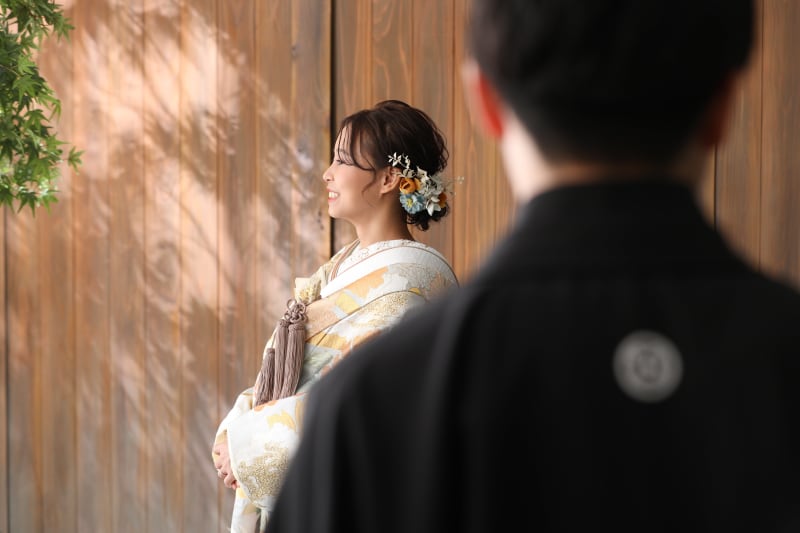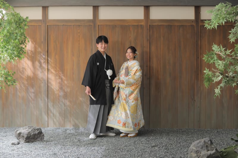 和装の伝統的な立ち姿!! こちらは、台紙にも入るかっちりとしたもっともフォーマルな立ち姿のお写真です。お二人の記念に是非今日という日を形に残しましょう。
