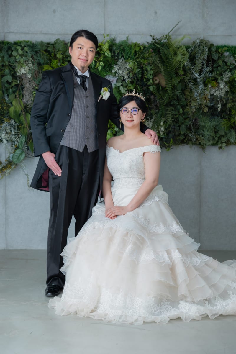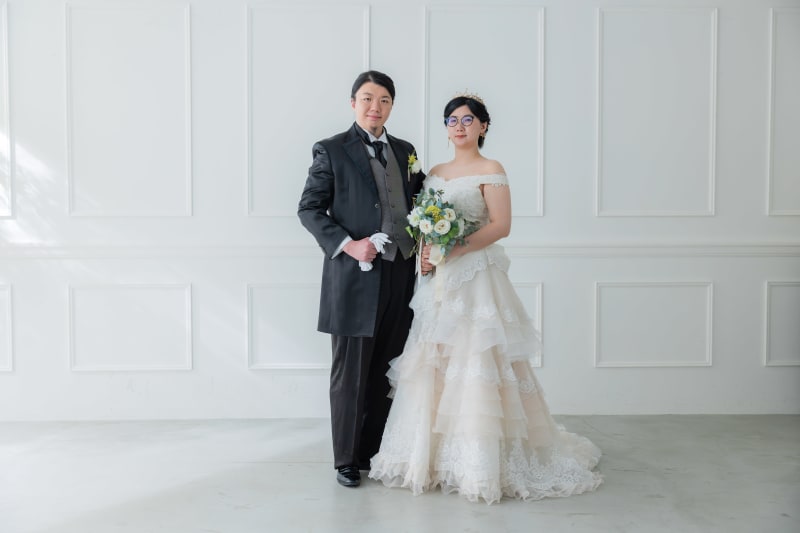 まずは、スタジオでかっちりとした立ち姿からお撮りいたします。背景がシンプルだからこそお二人の衣装が映えますね。