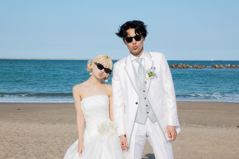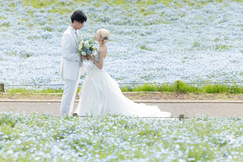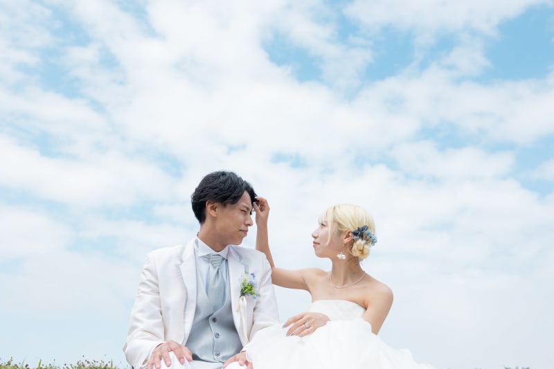 お二人の水色ベースのコーディネートと空の色の組み合わせ、