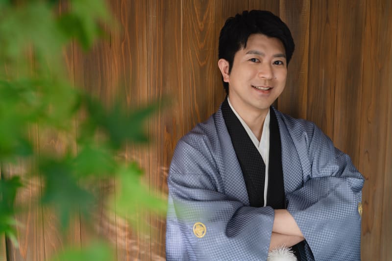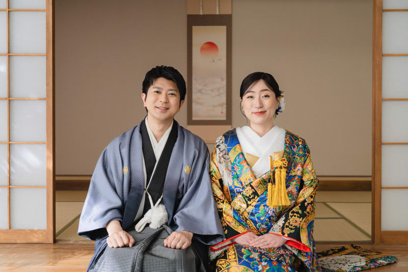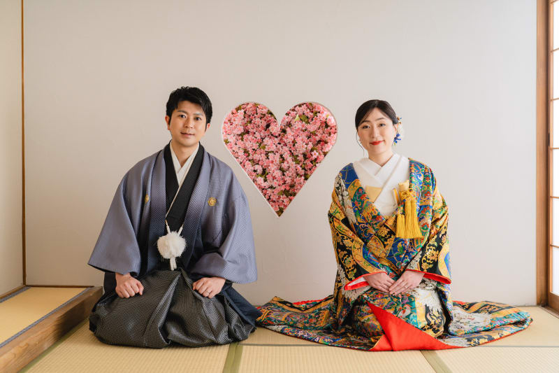 京都の宮大工さん監修で作り上げたお茶室の前で、お二人に並んでいただきました。ハートの猪目窓の前で和装ならではの正座ポーズ!