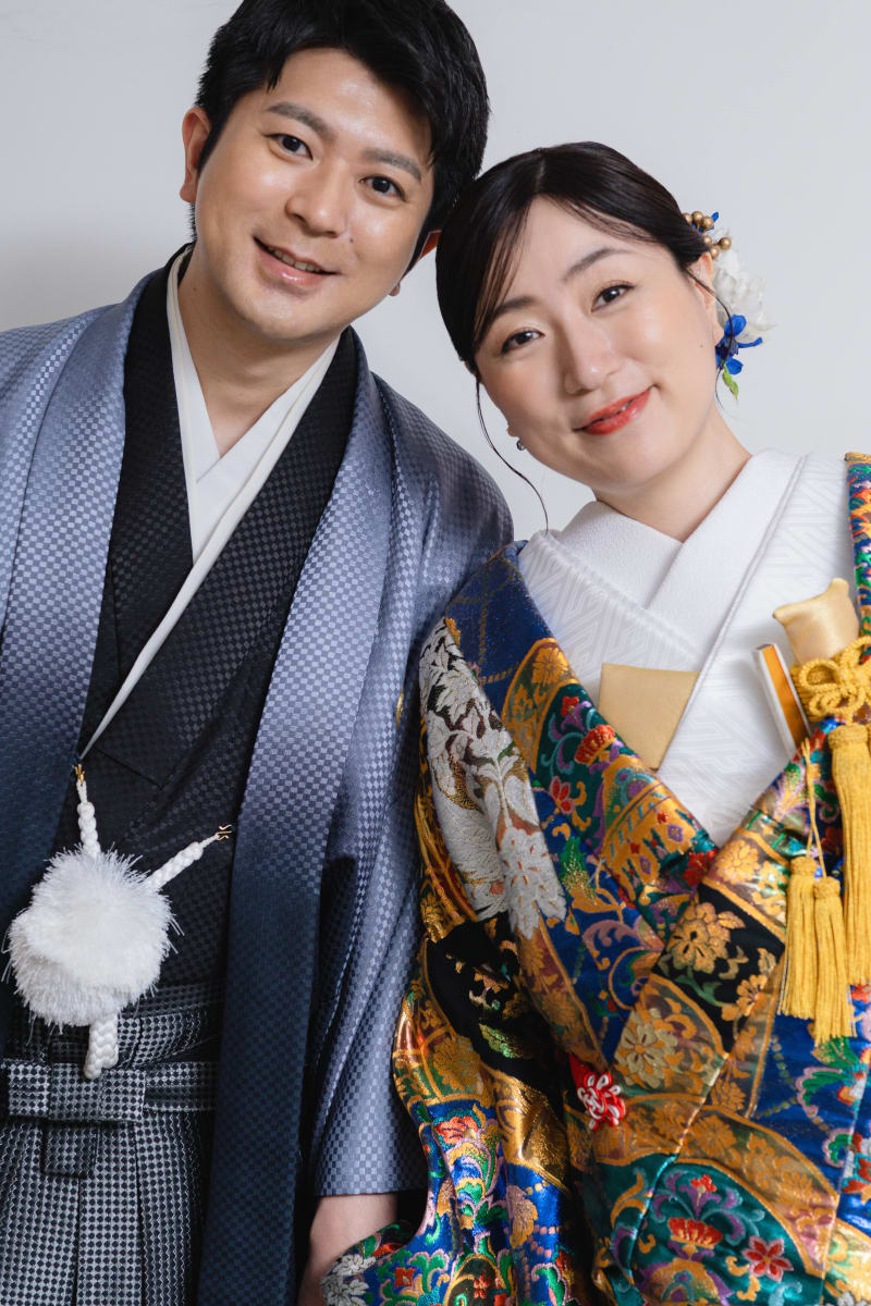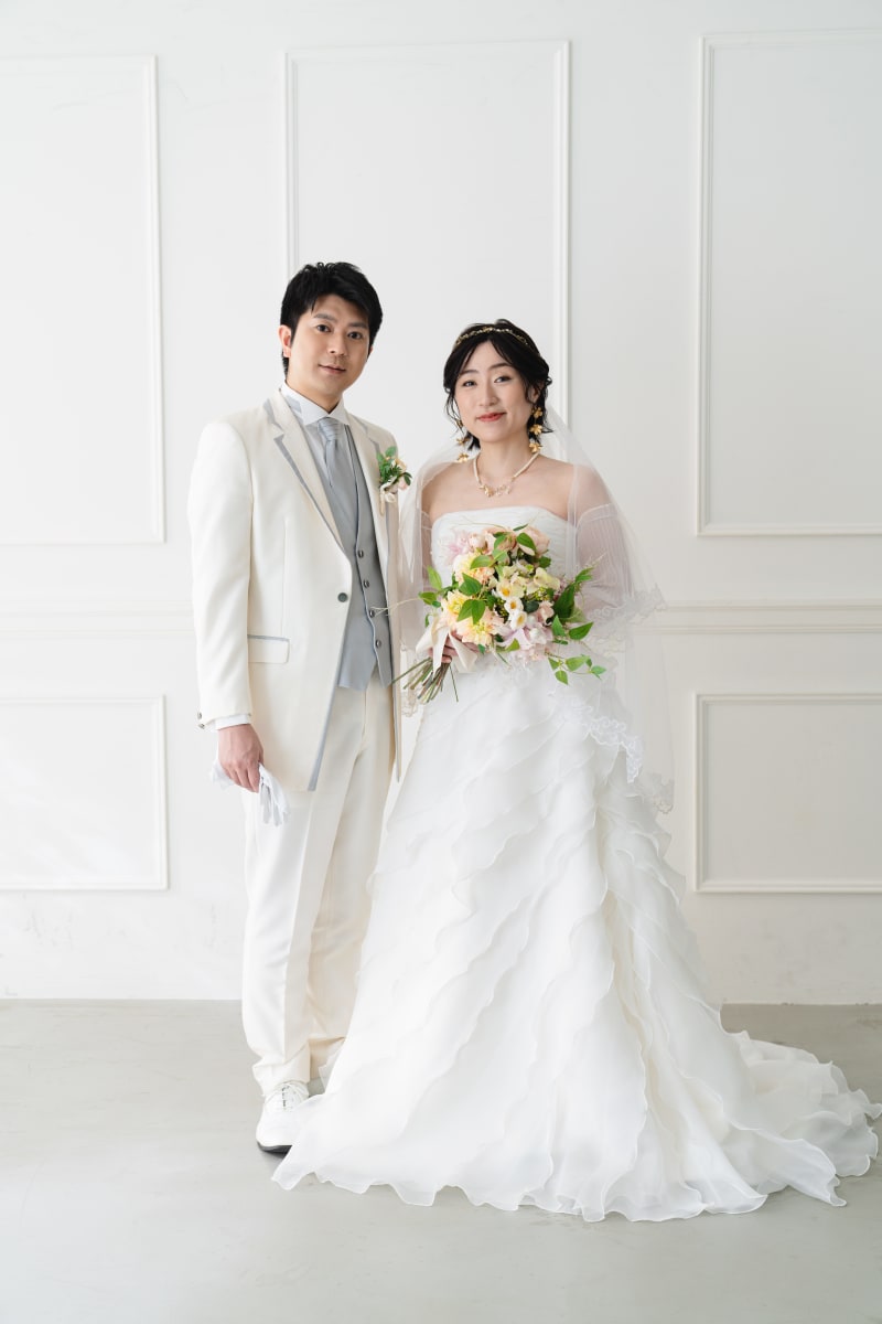 かっちりとした立ち姿もお撮りいたします。背景がシンプルだからこそお二人の衣装が映えますね