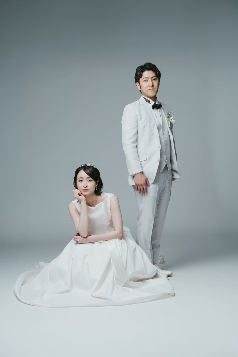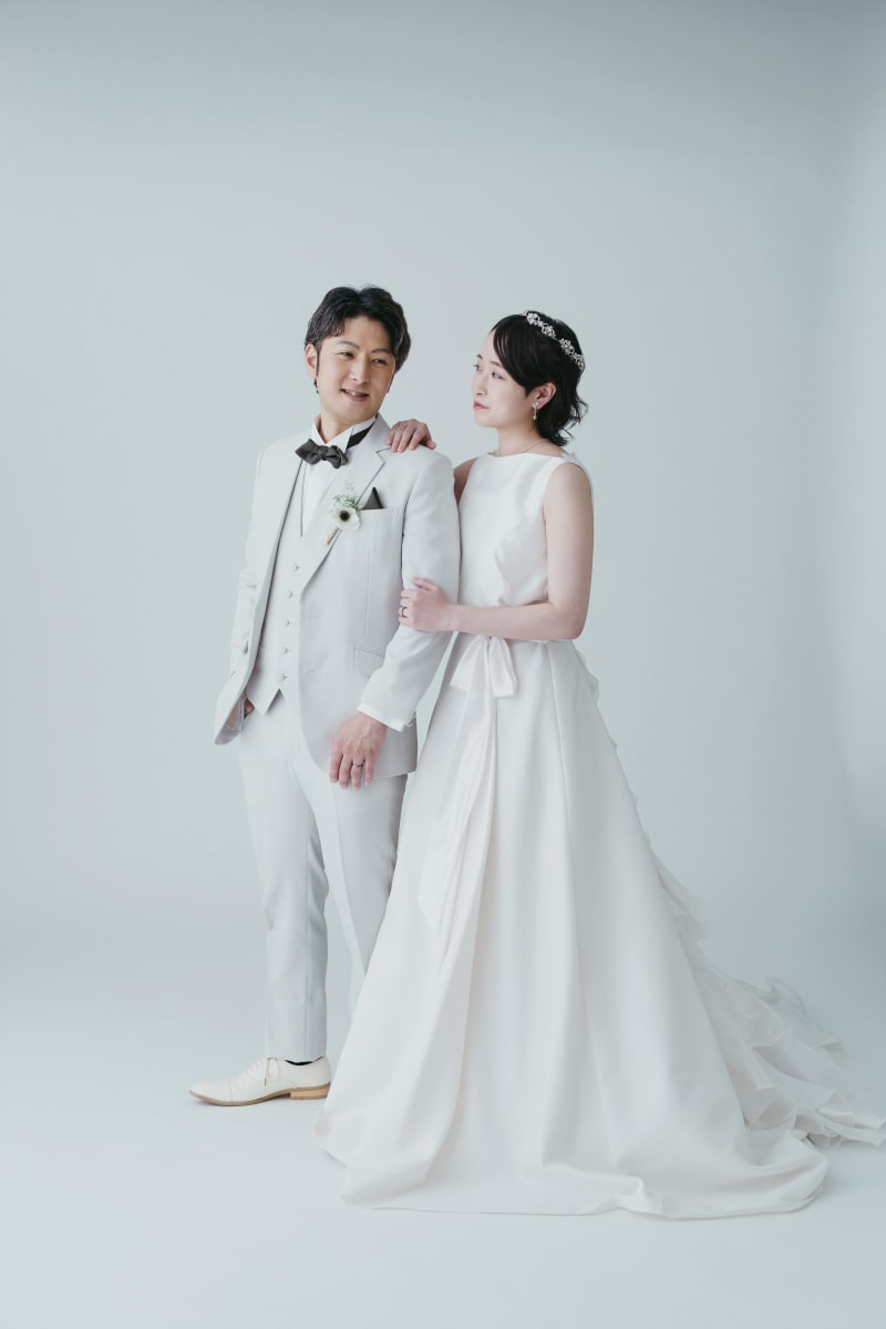 お次は、スタジオを変えて洋装の撮影!!洋装の撮影では、背景がシンプルだからこそお二人のお衣装が映えますね。洋装でももっちろんかっちりとした立ち姿もお撮りいたします。
