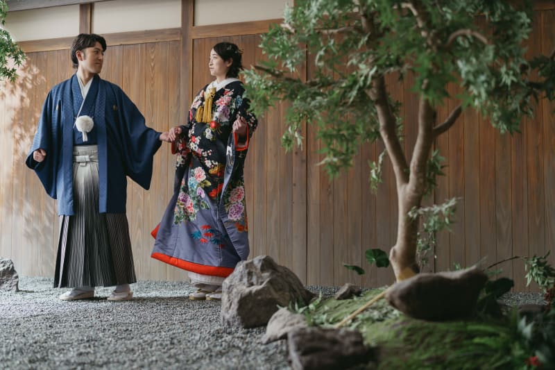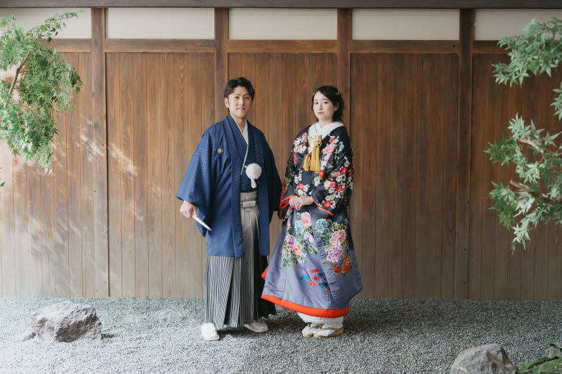 和装の伝統的な立ち姿です。こちらのカットは、台紙にも入る最もフォーマルな一枚です。お二人の記念に是非残しましょう。