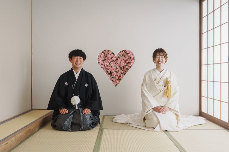 ハートの猪目窓の前で和装ならではの正座ポーズ!