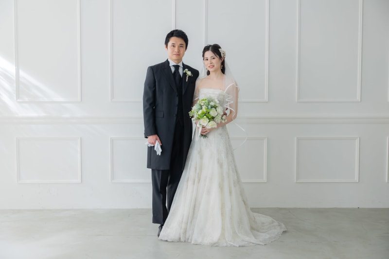 まずはナチュラルなホワイトの壁の前で撮影。 初めは、かっちりとした立ち姿からお撮りいたします。