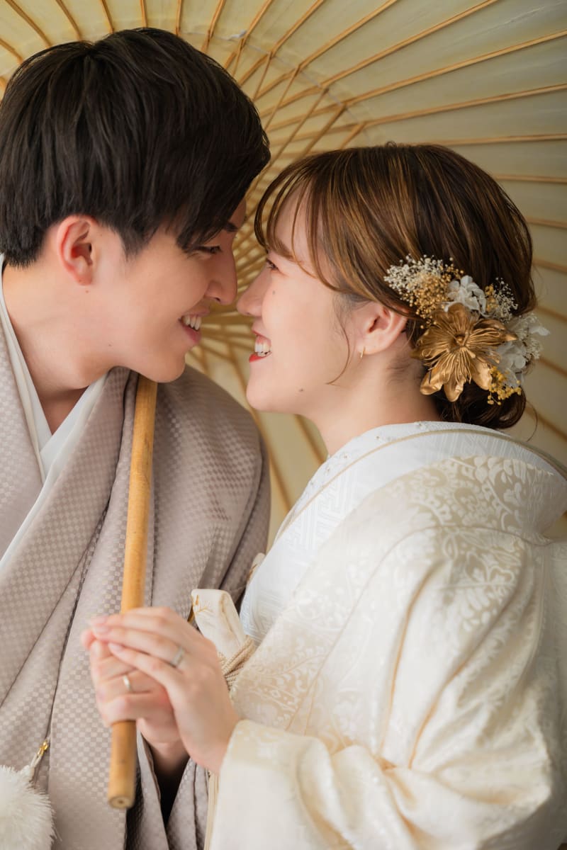 お互いを笑顔で見つめ合うお二人がとっても素敵です。