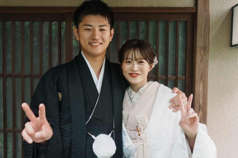 最後は、お二人仲良くピースで!! かっちりしたお写真だけでなくお二人のご希望に沿ったお写真もしっかりと撮影いたします。