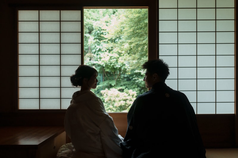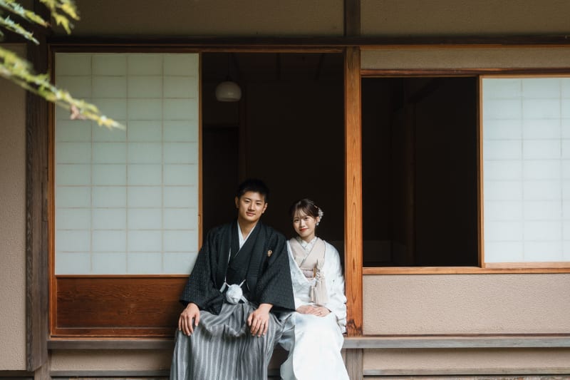 縁側で寄り添う姿は和装だからできるカットです!楽しくお話ししながら撮影も出来ちゃいます。