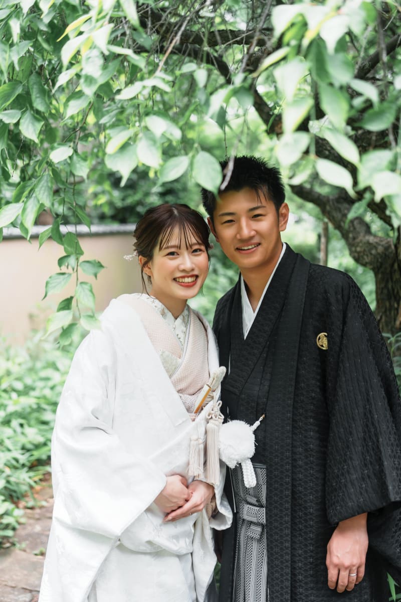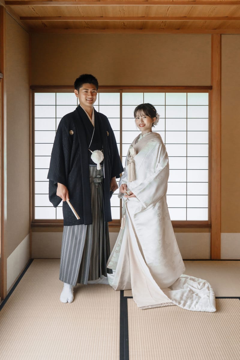 こちらは、台紙にも入る和装の最もフォーマルな立ち姿になります。ご新婦様のお衣装を綺麗に整えてからお撮りいたします。お二人の記念日に是非残しましょう。