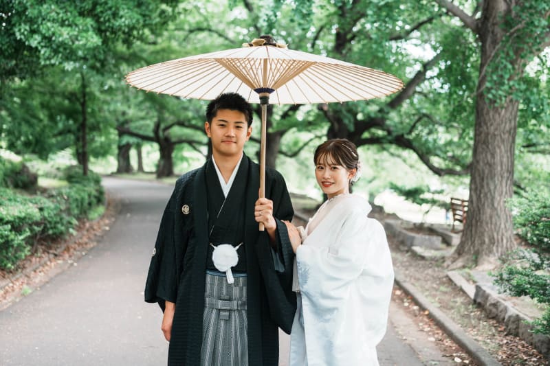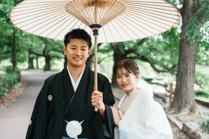 和装ならではの和傘を使用した一枚。 一気に和の雰囲気が出ますね!当店和傘は、無料で貸し出しを行なっております。